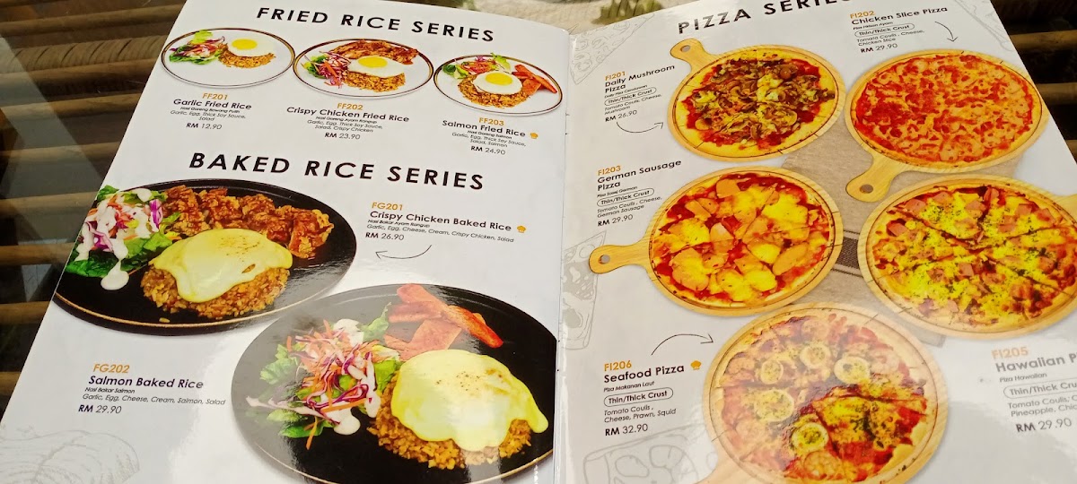 The Pizza Series offers a selection of pizzas topped with ingredients such as tomato coulis, cheese, mushrooms, German sausage, seafood, pineapple, and chicken slices. Popular choices include the Daily Mushroom Pizza, German Sausage Pizza, Seafood Pizza, Hawaiian Pizza, and Chicken Slice Pizza, with prices ranging from MYR 30.90 to MYR 33.90.